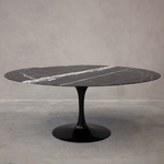 Existem móveis que preenchem um espaço. E existem móveis que o definem. A Mesa Saarinen com tampo em mármore Nero Marquina pertence ao segundo grupo. O preto profundo e absoluto, rasgado por veios brancos como relâmpagos em uma noite de tempestade, cria um impacto visual imediato e inesquecível. É o "pretinho básico" do design de luxo, uma peça que exala poder, sofisticação e uma personalidade inconfundível.